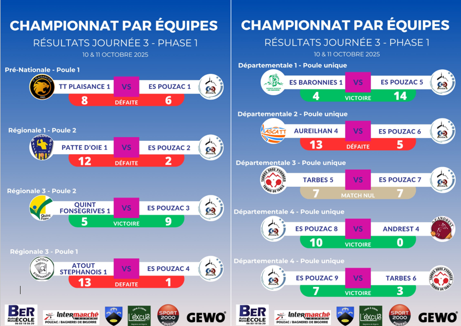 Le week-end dernier avait lieu la troisième journée du championnat par équipes. Voici les résultats de nos 9 équipes en lice :