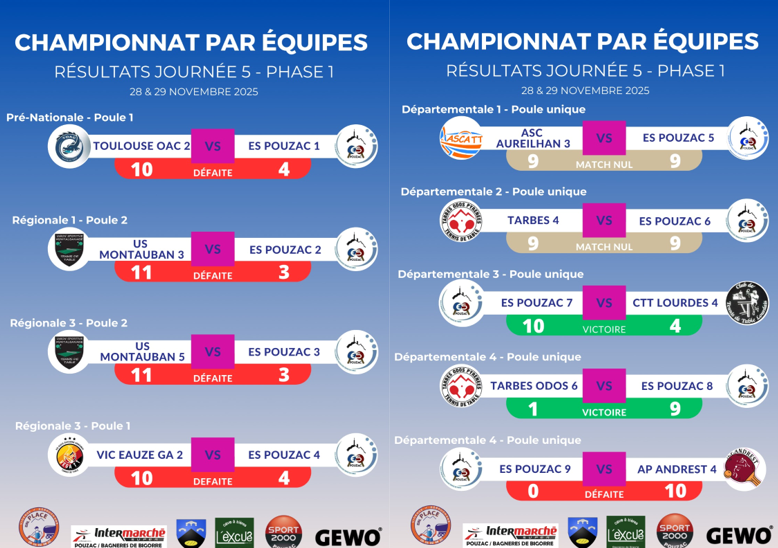 Le week-end dernier avait lieu la cinquième journée du championnat par équipes. Voici les résultats de nos 9 équipes en lice :