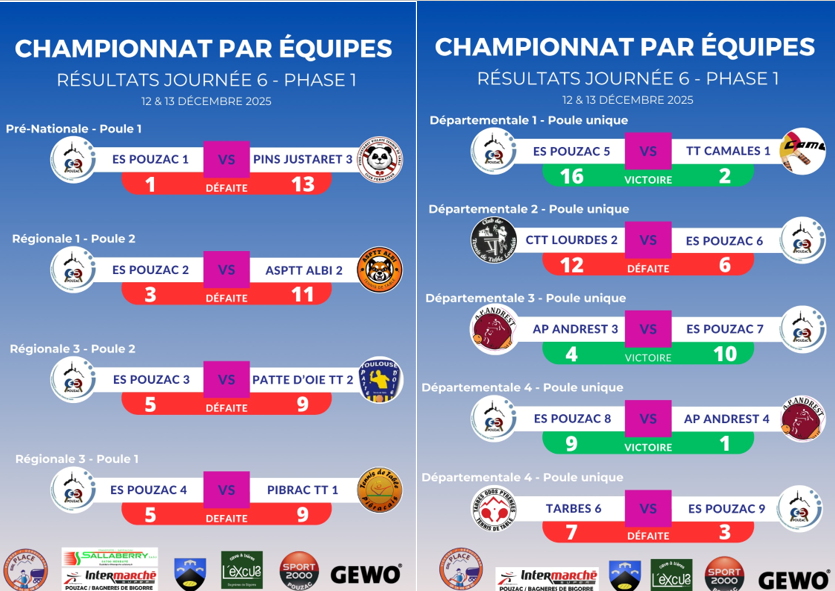 En départementale 4, fortunes opposées pour nos deux formations. L'équipe 8 s'impose 9-1 face à Andrest 4 . Bravo à Peïo (3+double), Noé (3) et Ion (2+double). L'équipe est sacrée championne mais ne montera pas (pas de montée dans cette division). Défaite pour la 9 contre Tarbes-Odos 6, un score de 3-7. Kilian passe pas loin de gagner son premier match lors de son baptême du feu! Bravo à Audrey (2), Diego (1) et Kilian.