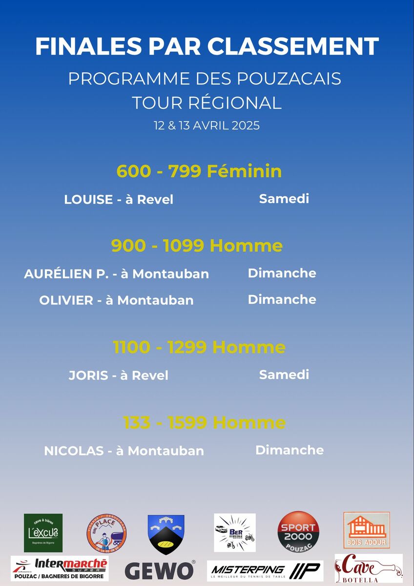 Les finales par classement Régionales ont lieu à Revel (31) et à Montauban (82) et sont qualificatives pour le tour national. Nos représentants par tableaux: