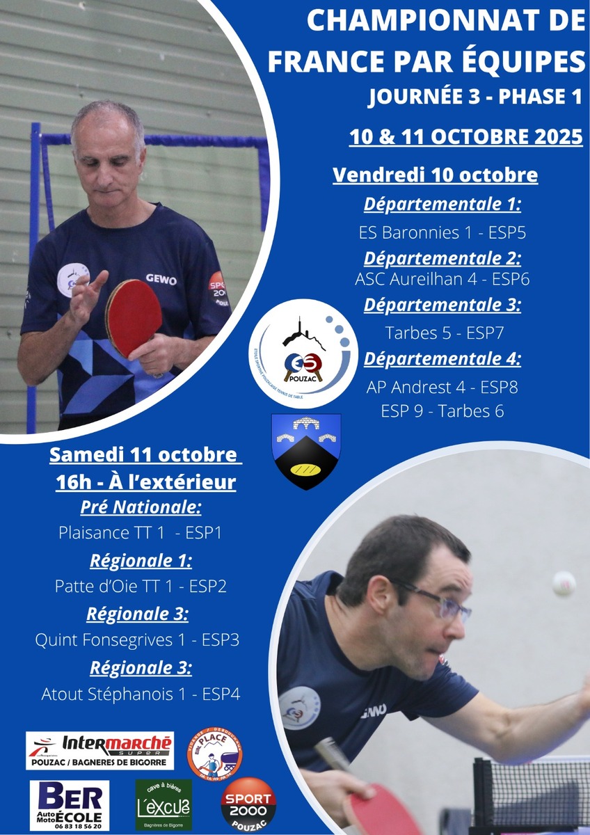 L'équipe 1 en Pré-Nationale, se déplacera au TT Plaisançois 1 (Plaisance-du-Touch, 31).