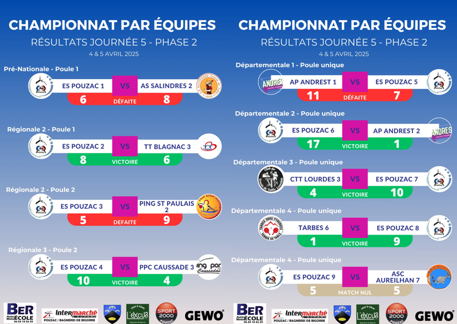 Le week-end dernier a eu lieu la 5eme journée du championnat par équipes. Voici les résultats de nos pouzacais :